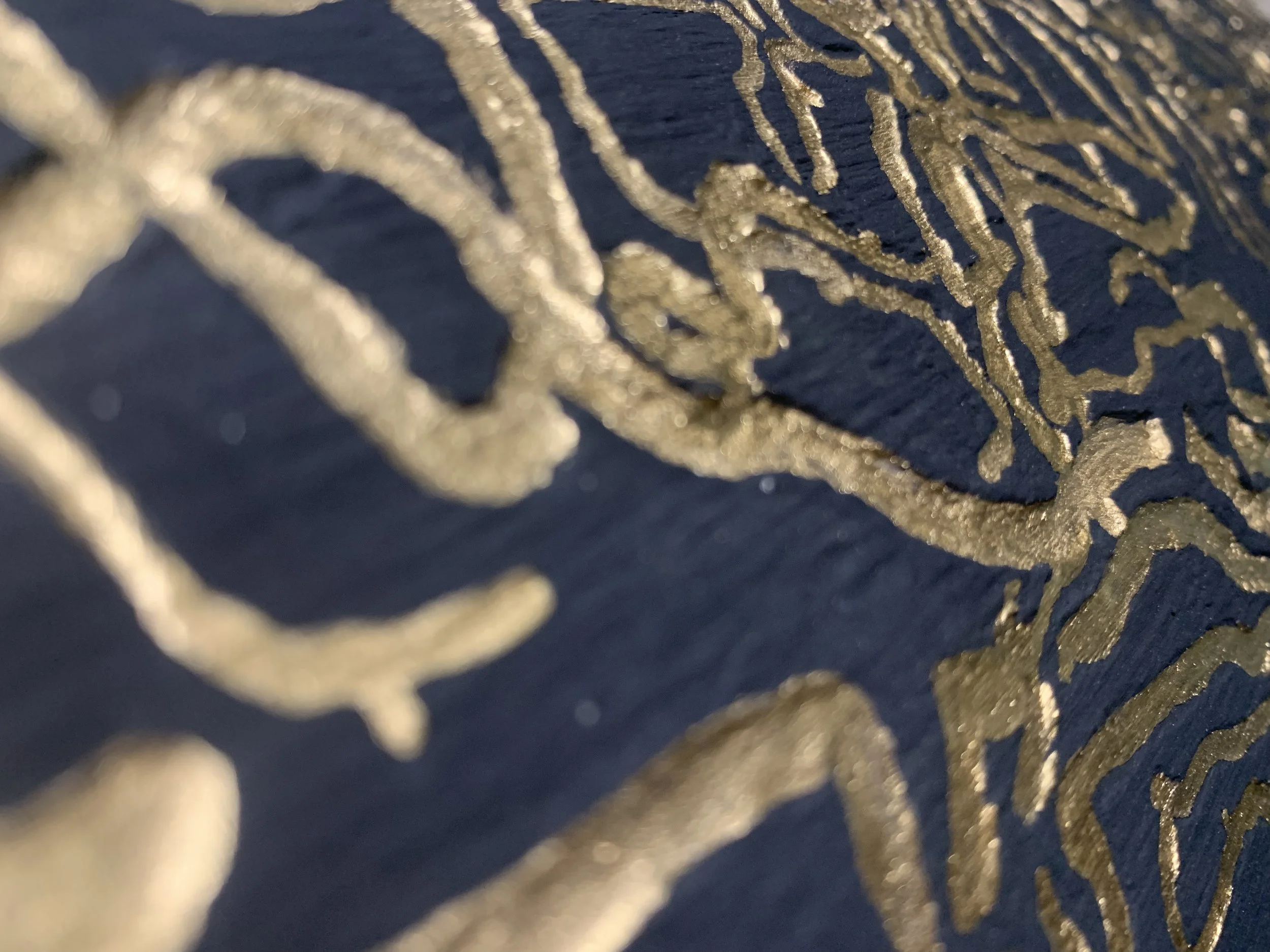 “CODEX | DECOMPOSERS, Transcriptions and AI translations of pine bark beetle galleries in São Luis, PT.” Gold ornamental frame, gold leaf beetle gallery and AI translation. 2022